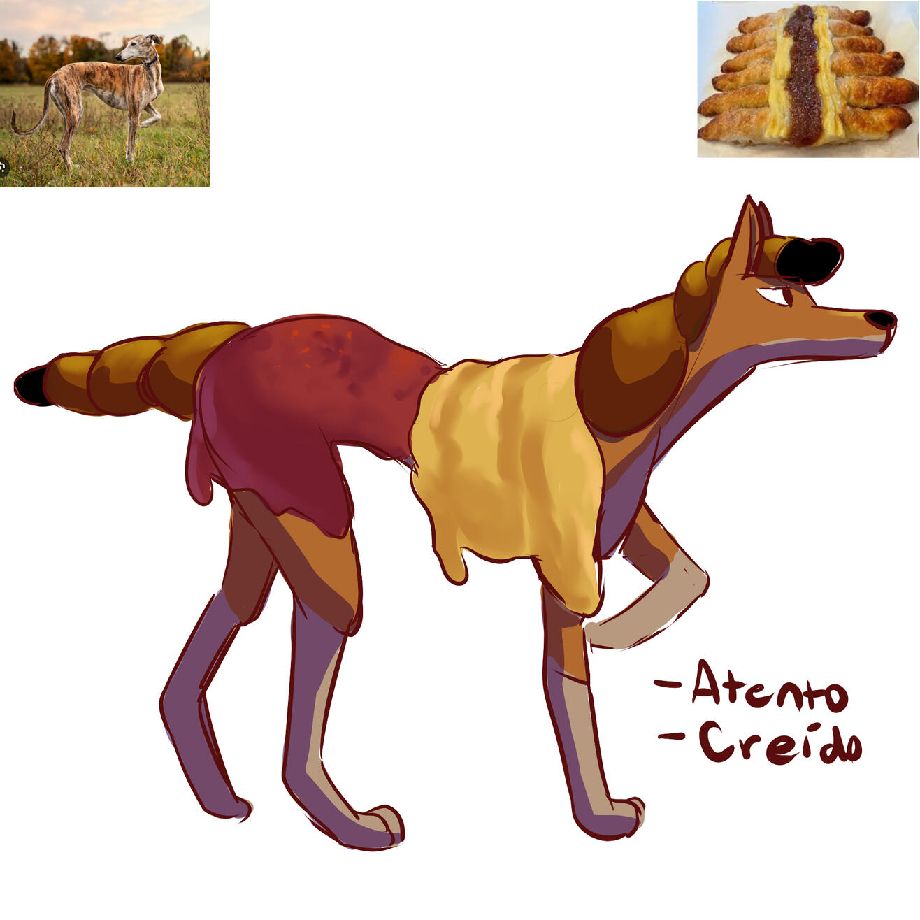 Concept art of the "perro vigilante" or guard dog. This mix of a greyhound dog and a pastry called "vigilante" (which could be translated as guard or watchman) is one of the three Factura (pastry) type argenimals. It's a quick attacker that is always on the watch.