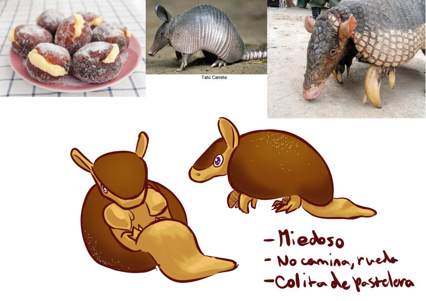 This argenimal is the Pastry type's tank. It's a mix of an armadillo and a pastry called "bolita de fraile" Which is a round pastry filled with cream. In this case, the dough is the shell. Because of its fragile interior, this creature doesn't walk but roll around to move.