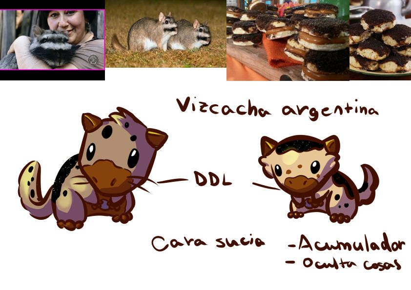 This argenimal is a mix of the argentinian vizcacha and the pastry called "tortita negra" or black little cake is the quickest attacker of the three pastry type argenimals. The pastry, also called "cara sucia" or dirty face often has a filling of dulce de leche which is shown in this creature's brown snout.